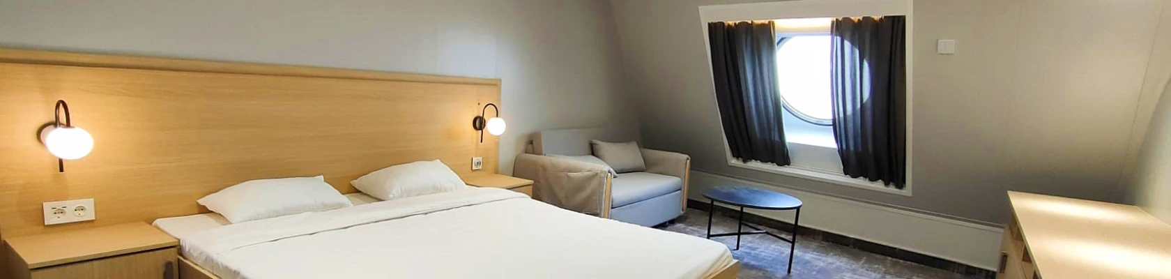 Cabina doppia esterna con oblò Cabina di ponte superiore con 2 posti letto e servizi interni con doccia, con oblò. Anche in versione con letto a castello. (C2E)